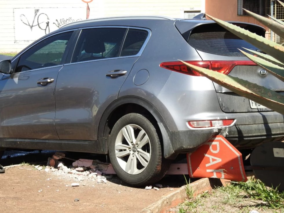 Uma SUV atingiu a lateral de um carro, depois bateu em um coqueiro, voltou de ré e parou em uma placa de sinalização, no início da tarde desta sexta-feira (24), no Jardim Nova América, em Araraquara.